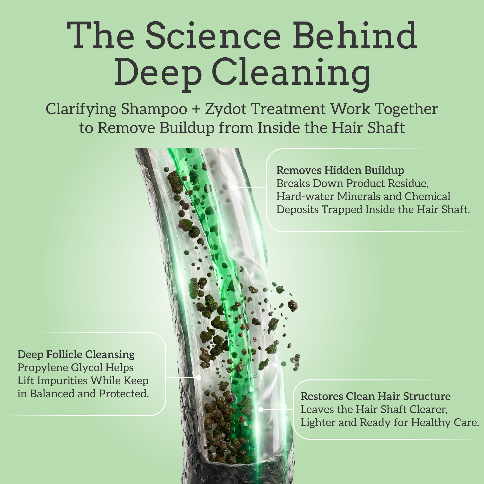 • Final Cleansing Step: Zydot Ultra Clean is used on the day as the final step. This three-part treatment—shampoo, purifier, and conditioner—removes external buildup and residual impurities, leaving hair soft and manageable.