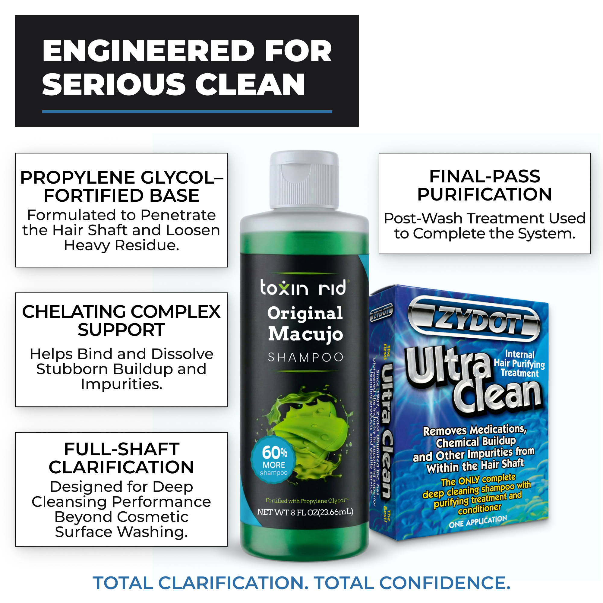 What’s Included: 1 Bottle – Macujo Aloe Toxin Rid Shampoo & 1 Box – Zydot Ultra Clean (Single-Use Three-Part Kit)